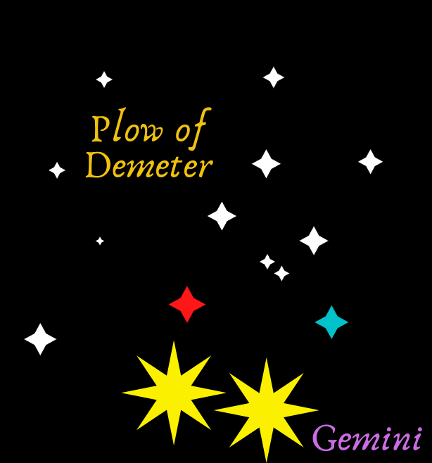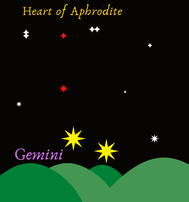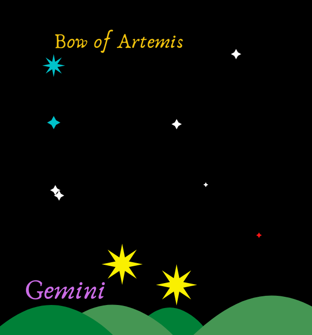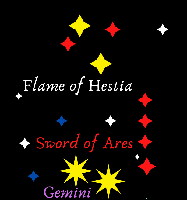 The Arcadian year is divided into 11 months to honor each of the Olympian gods who travelled from Earth to found our world. Ares, the God of War, was not included among the months, because his worship is forbidden. Mother Hestia commanded he be given a constellation to acknowledge his divinity. The Gemini are two large stars on the northern horizon visible day and night. They serve as the marker stars for the constellations.